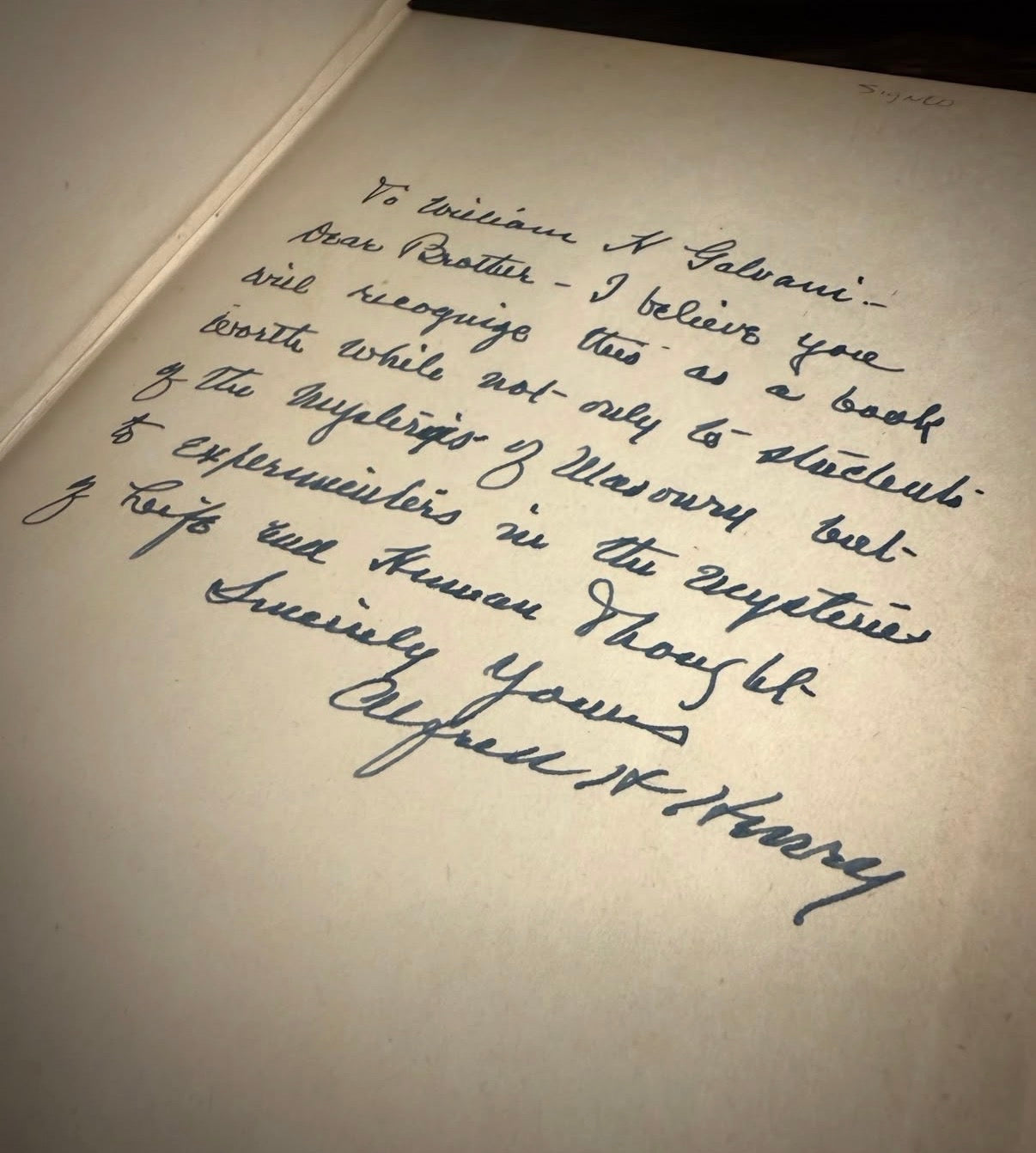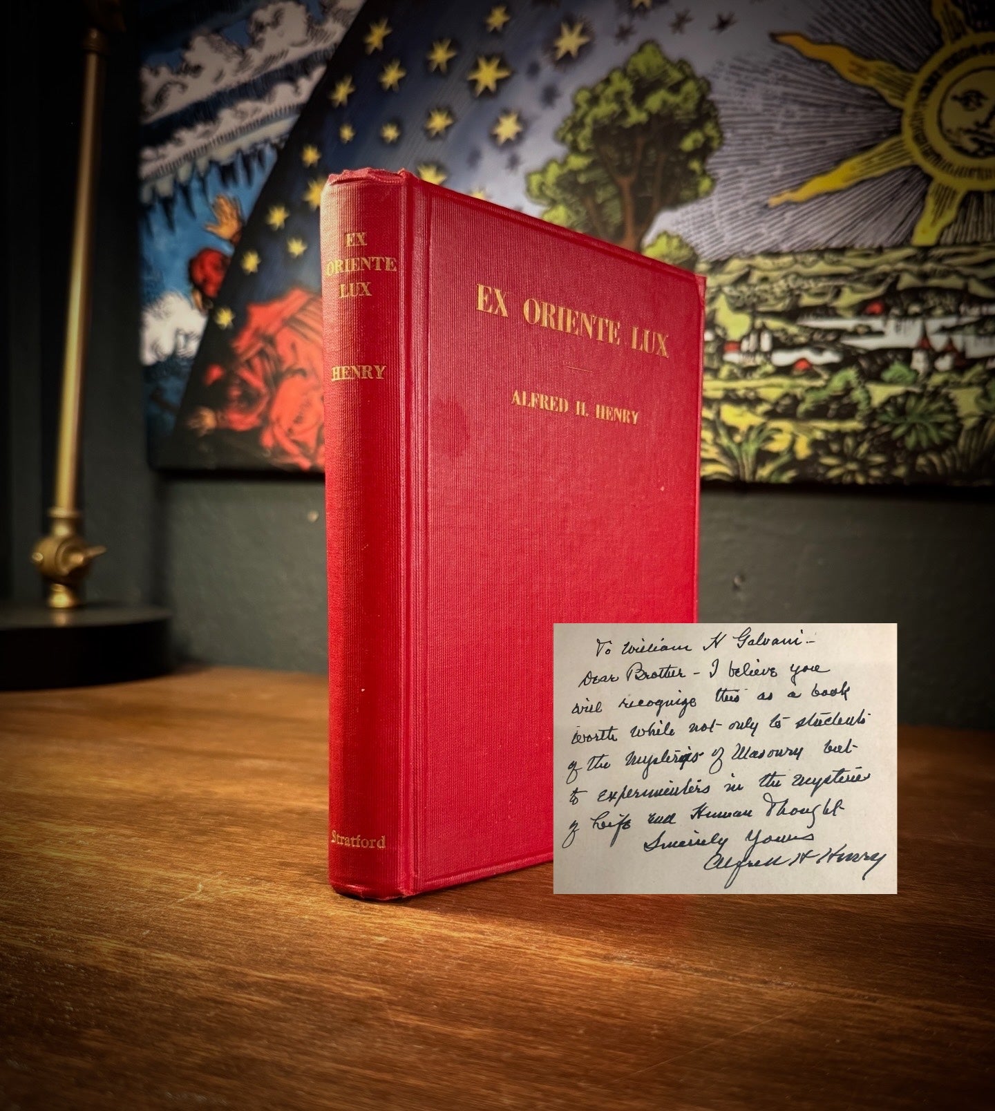 Signed and Inscribed by author on front free endpaper "To William H. Galvani - Dear Brother i believe you will recognize this as a book worth while not only to students of the Mysteries of Masonry but to experiementers in the mysteries of life and human thought . Sincerely yours, Alfred H. Henry"